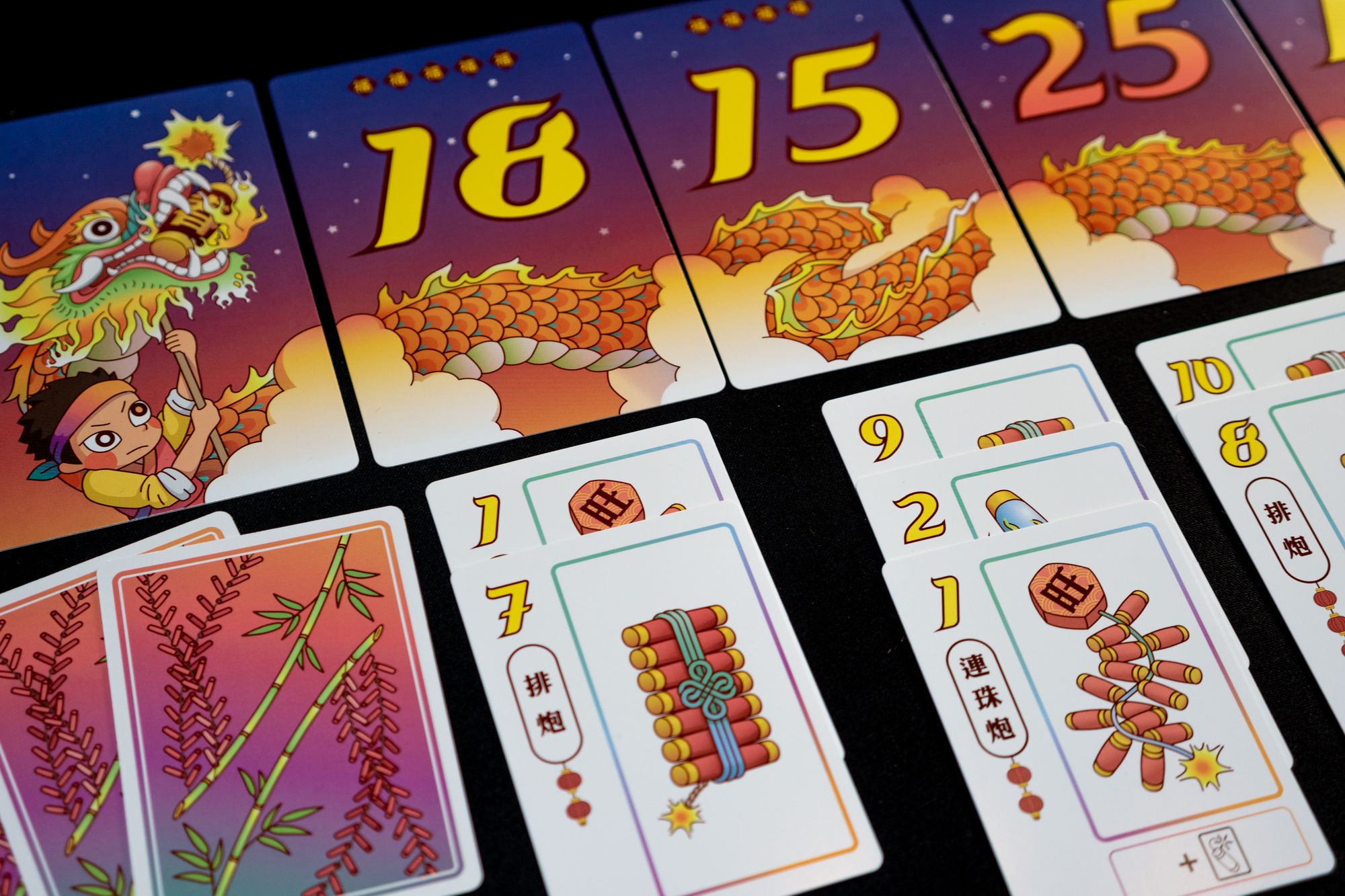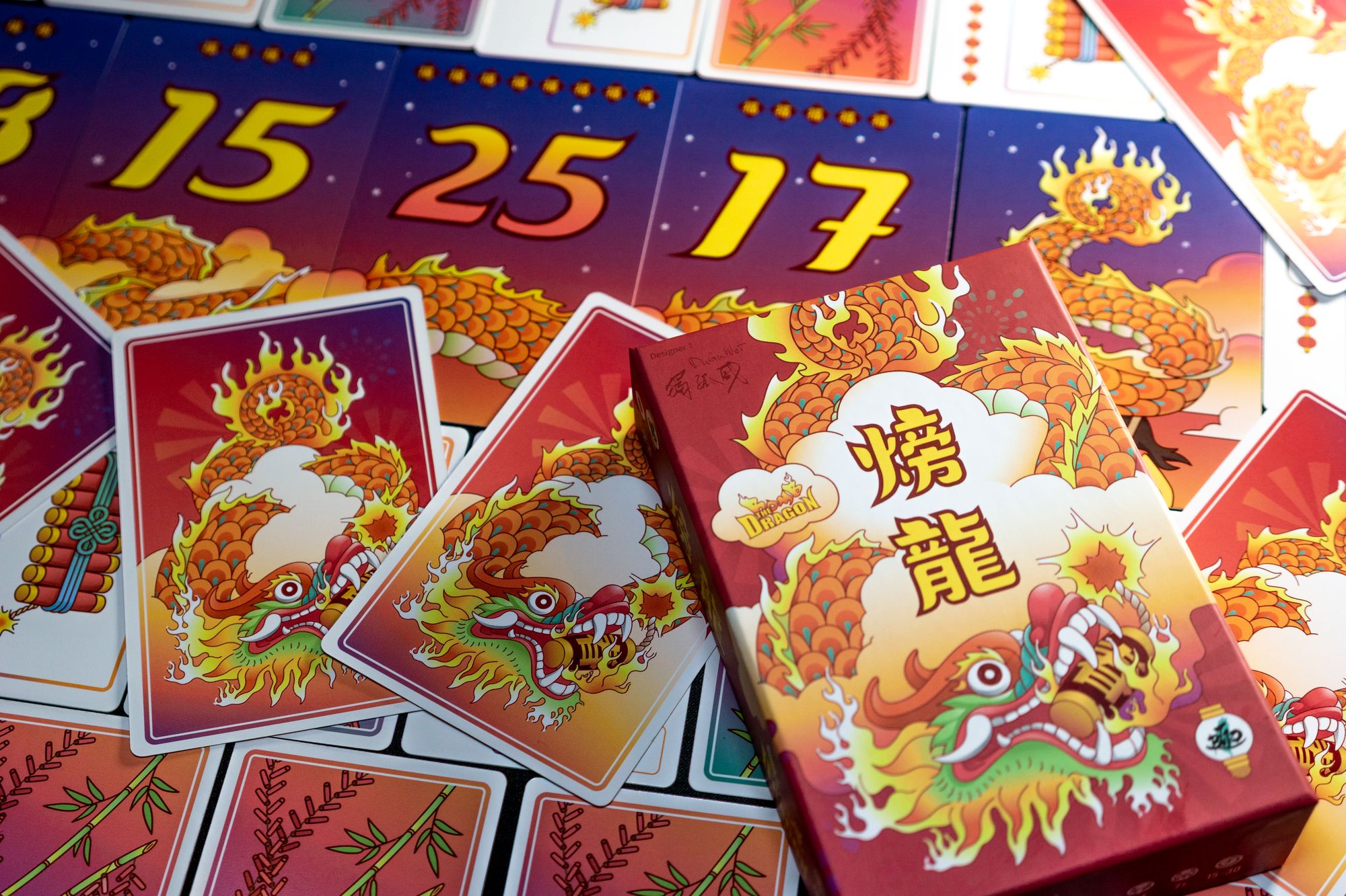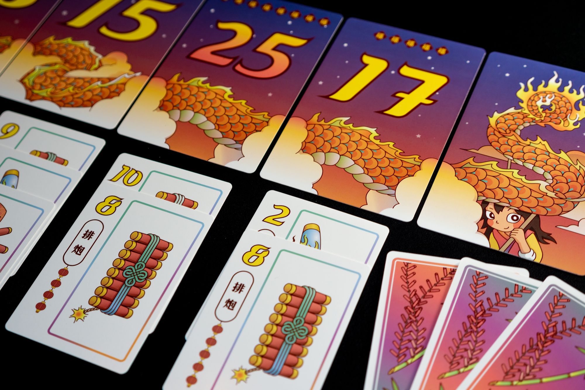 To play the game, you shuffle the 19 dragon-body cards and layout dragon-body cards based on the number of players face-up between the dragon-head card and the dragon-tail card. Then you mix the 45 firecracker cards and deal three cards to each player.