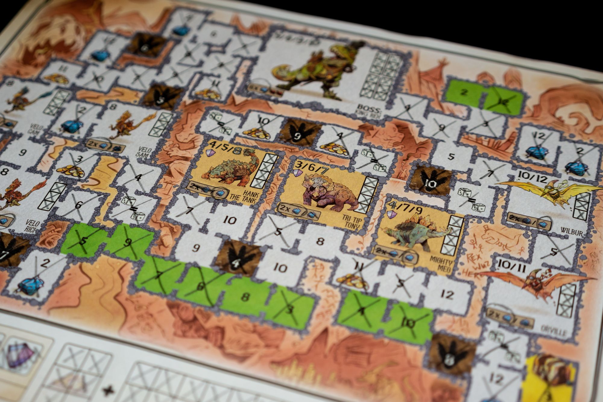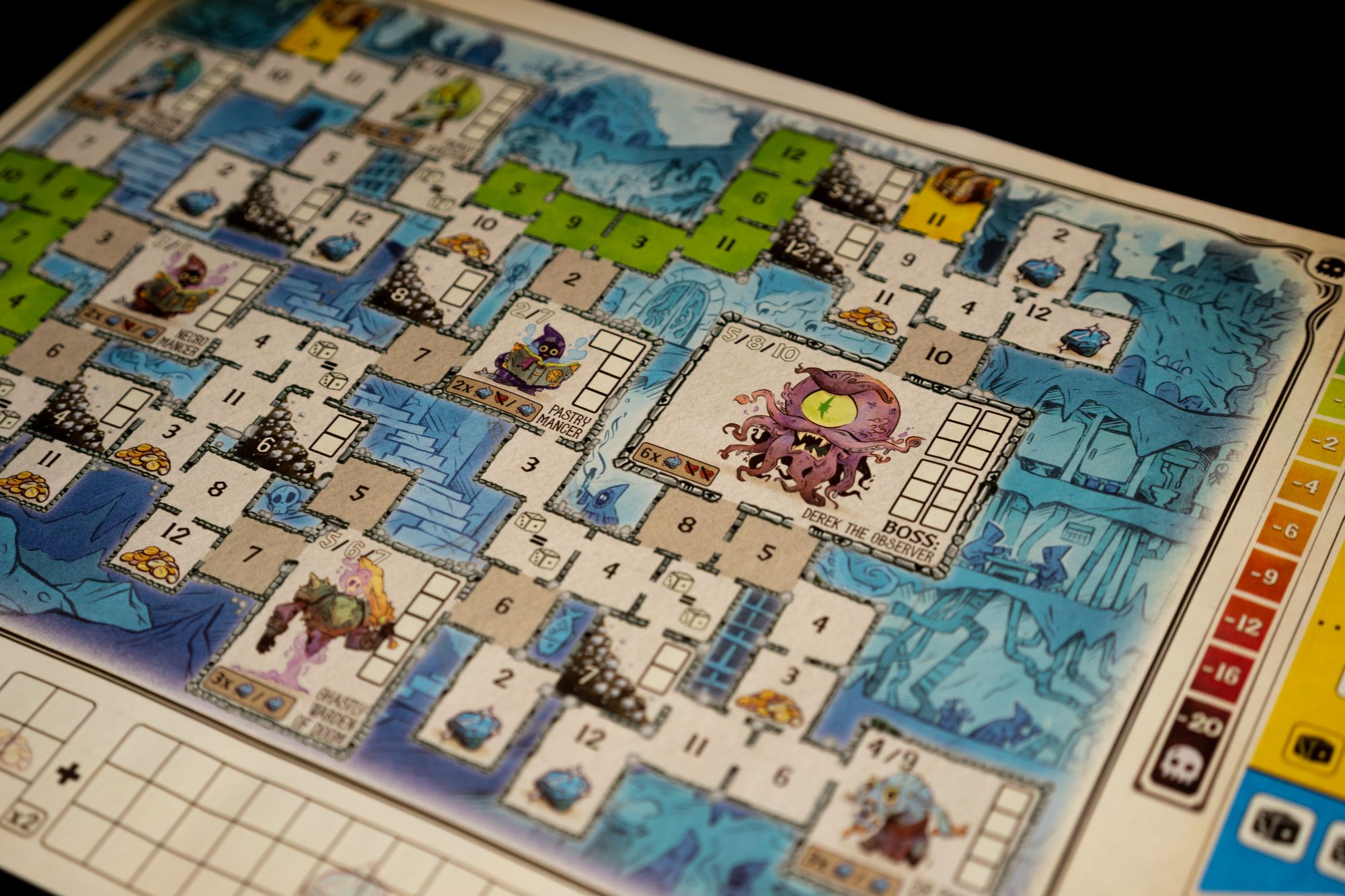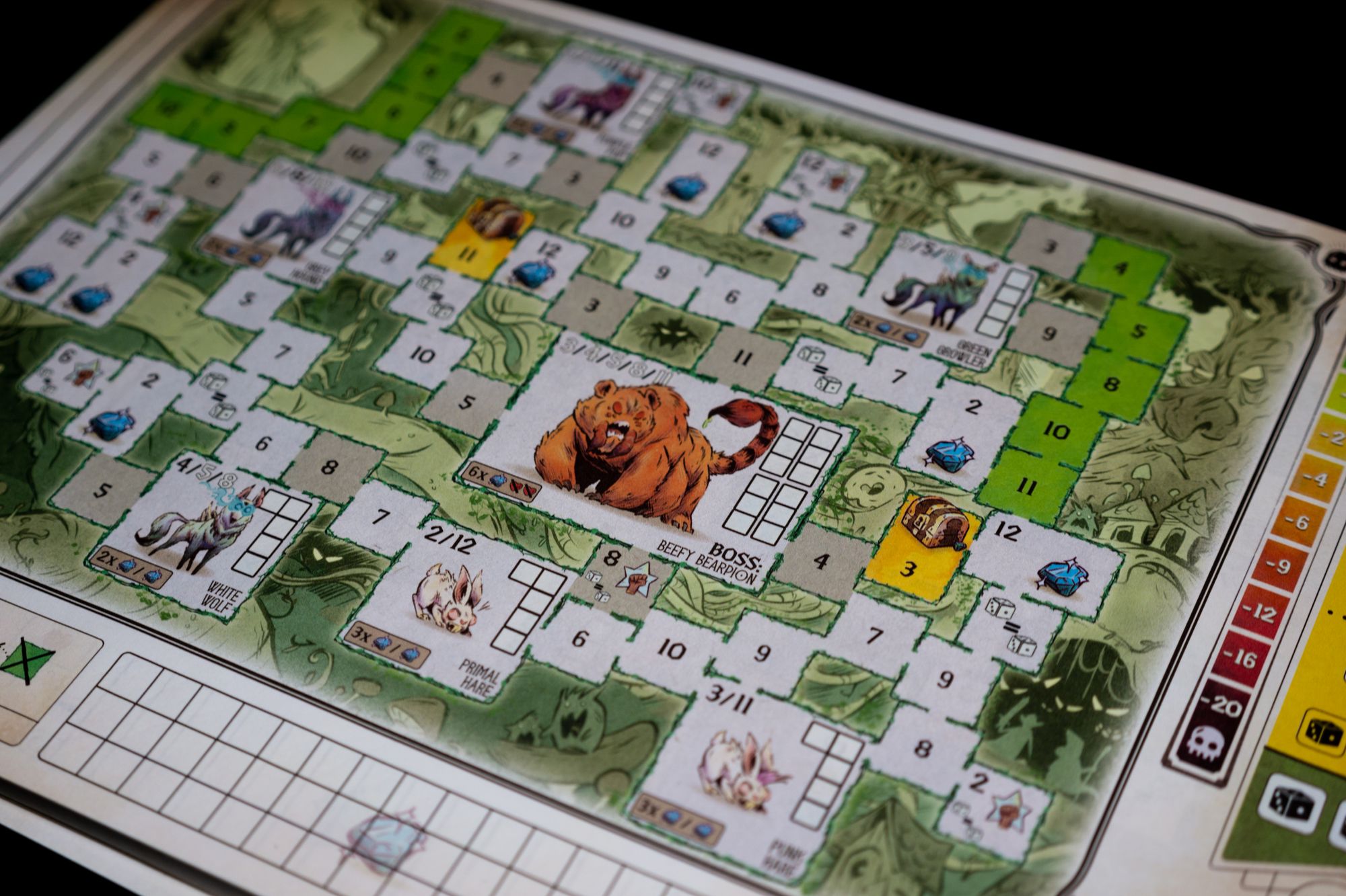 The game comes with 4 different dungeons to explore with varying challenges. Each space that is crossed off can either be a normal space or a special space containing gems or coins. Once you've reached a monster you need to hit it a few times with a number printed in black. Surrounding a monster from multiple sides sometimes unlocks other numbers that can also be used to damage the monster. Each dungeon has a few additional rules that you need to follow.