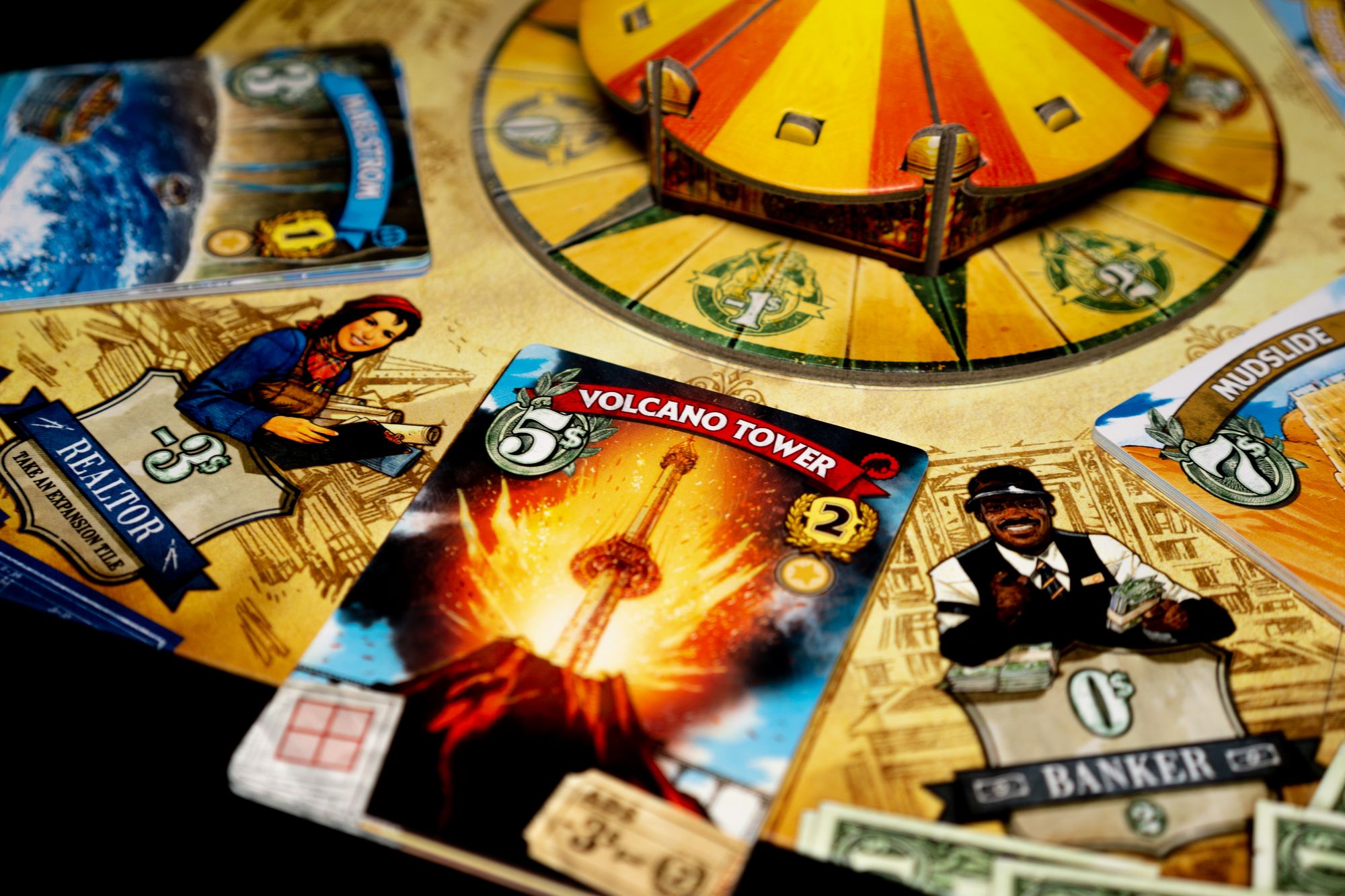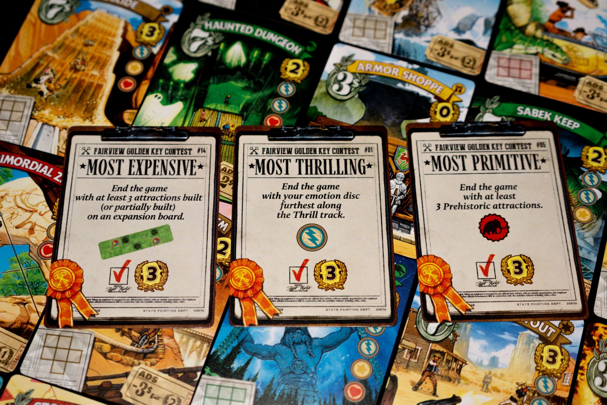 At dawn, the trumpets sound, Mayor Tenpenny’s shovel breaks ground, and the race is on! You have five months to transform the humble town of Fairview into the home of the world’s greatest theme parks. Gather your team of bankers, realtors, contractors, builders, and arborists. Construct rides through the stone age, the American old west, the age of fantasy, the cosmos of space, and the depths of the sea. Inspire thrill, awe, and joy in your guests to earn their tickets, for whoever attracts the most vistors at the end of the race will be awarded Fairview’s Golden Key!