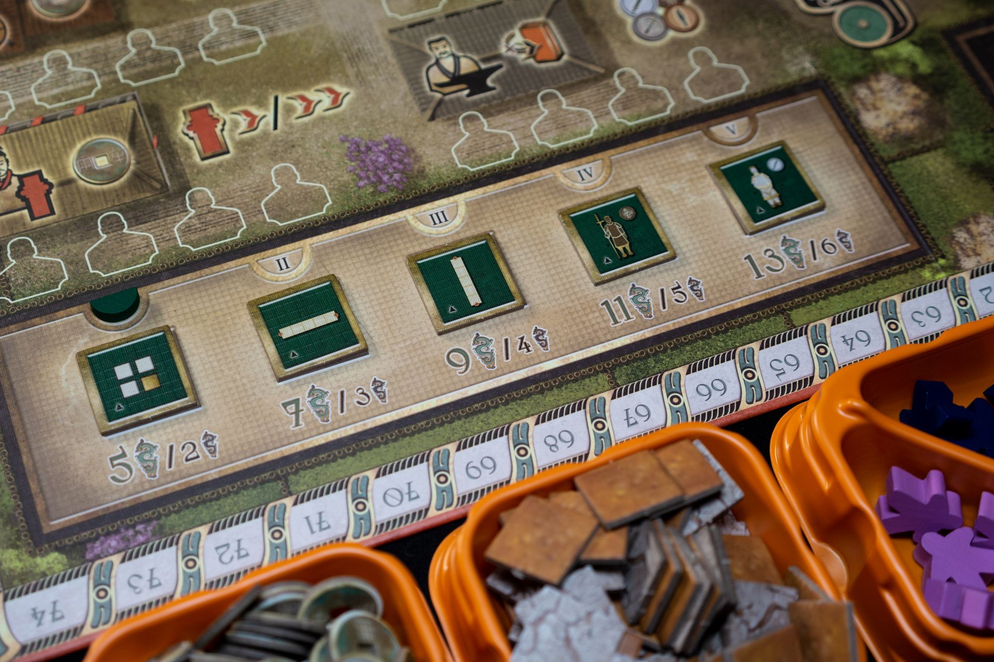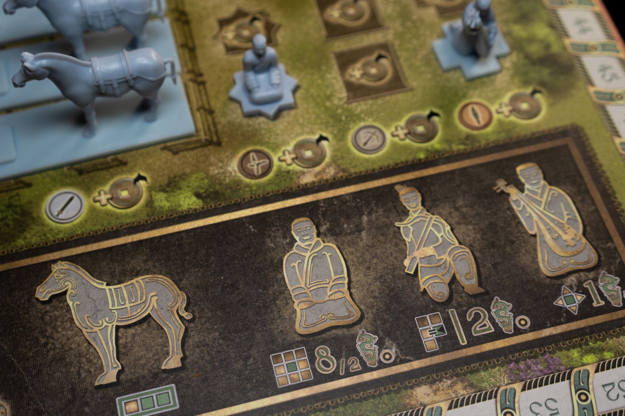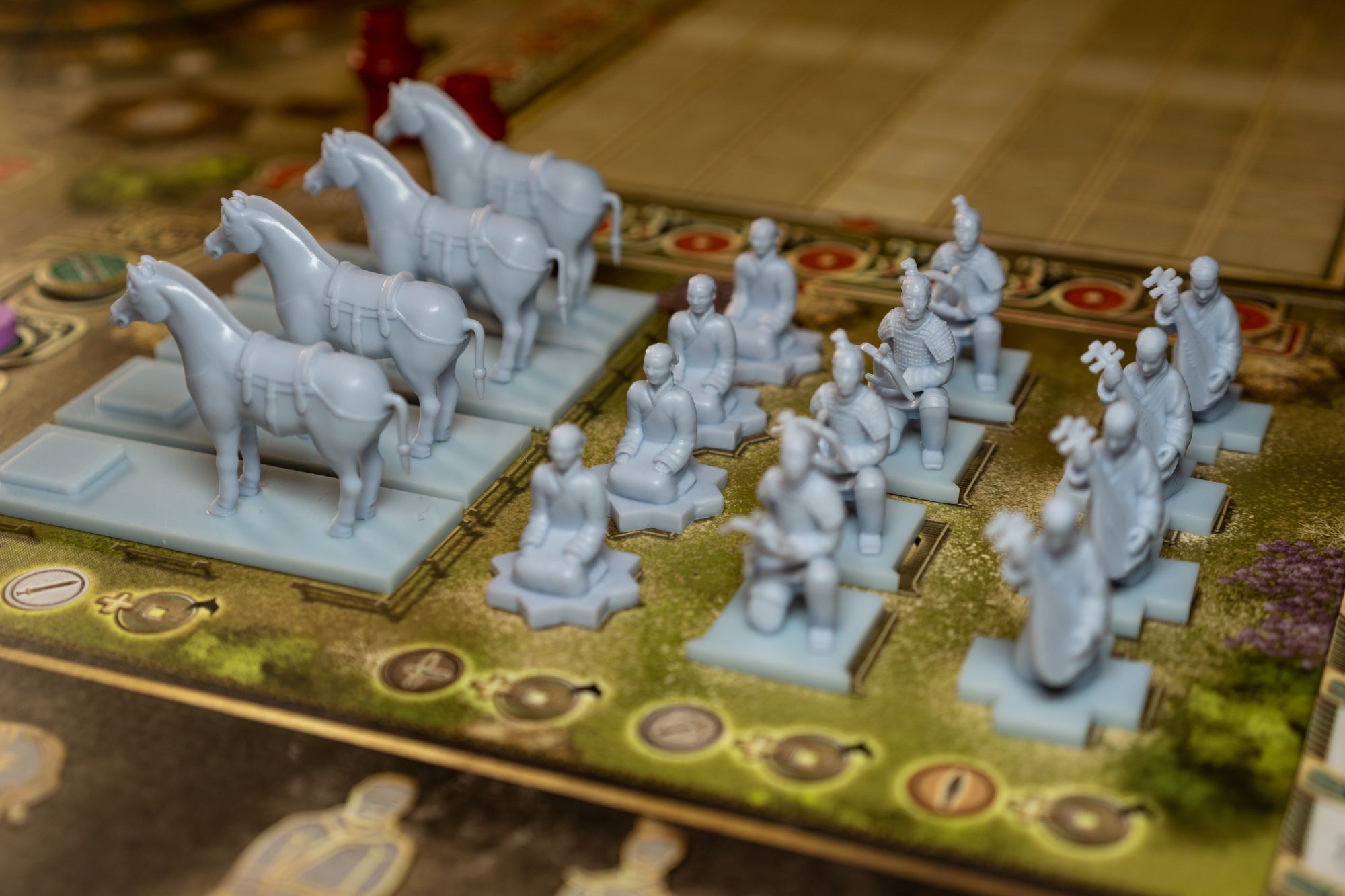 The miniatures are actually what this game is all about. Terracotta Army is a heavy (is it the heaviest out there?) tile-placement game, but instead of tiles, you're placing miniatures onto a grid. You have two categories of miniatures: Warrior or Specialist. Warriors are divided into four types: Officers, Crossbowmen, Guards, and Soldiers. As players, you try to place these in a way to form groups and score the best at the end of the round. Warriors are owned by a specific player, denoted by the miniature's base. Specialists are divided into four types: Musicians, Footmen, Kneeling Archers, and Horses. You try to place these as best as possible to get the most benefits. These are not owned by any player, and all players can benefit from them. Each Warrior has a special power that can be used when deployed by flipping over a matching weapon token. The specialists also provide various benefits that should be carefully considered.