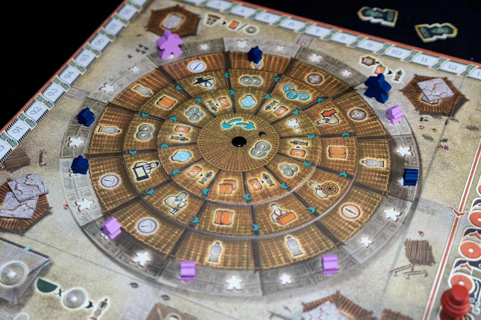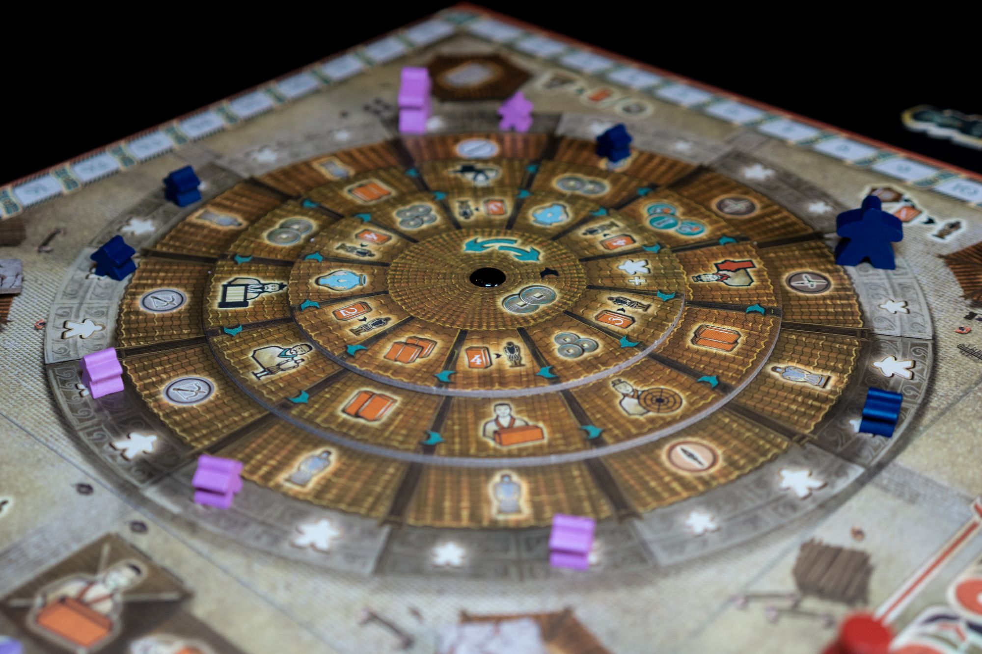 The game is played over five rounds and in which players will place their workers on the rondel to perform actions. At the end of each round interim scoring takes place. First, the inspectors will provide points to the row and column based on their current position. Second, the musicians will award points to players in their line of sight. Lastly, the round scoring is evaluated.