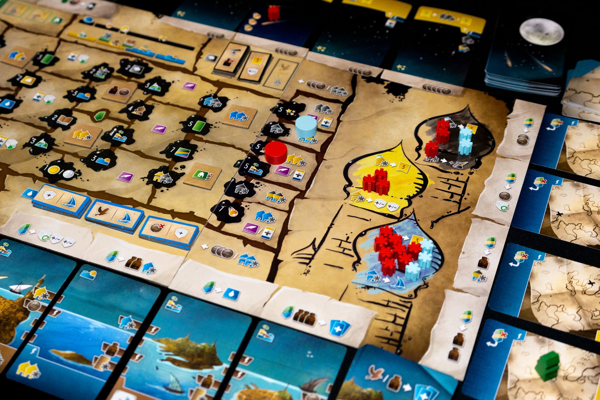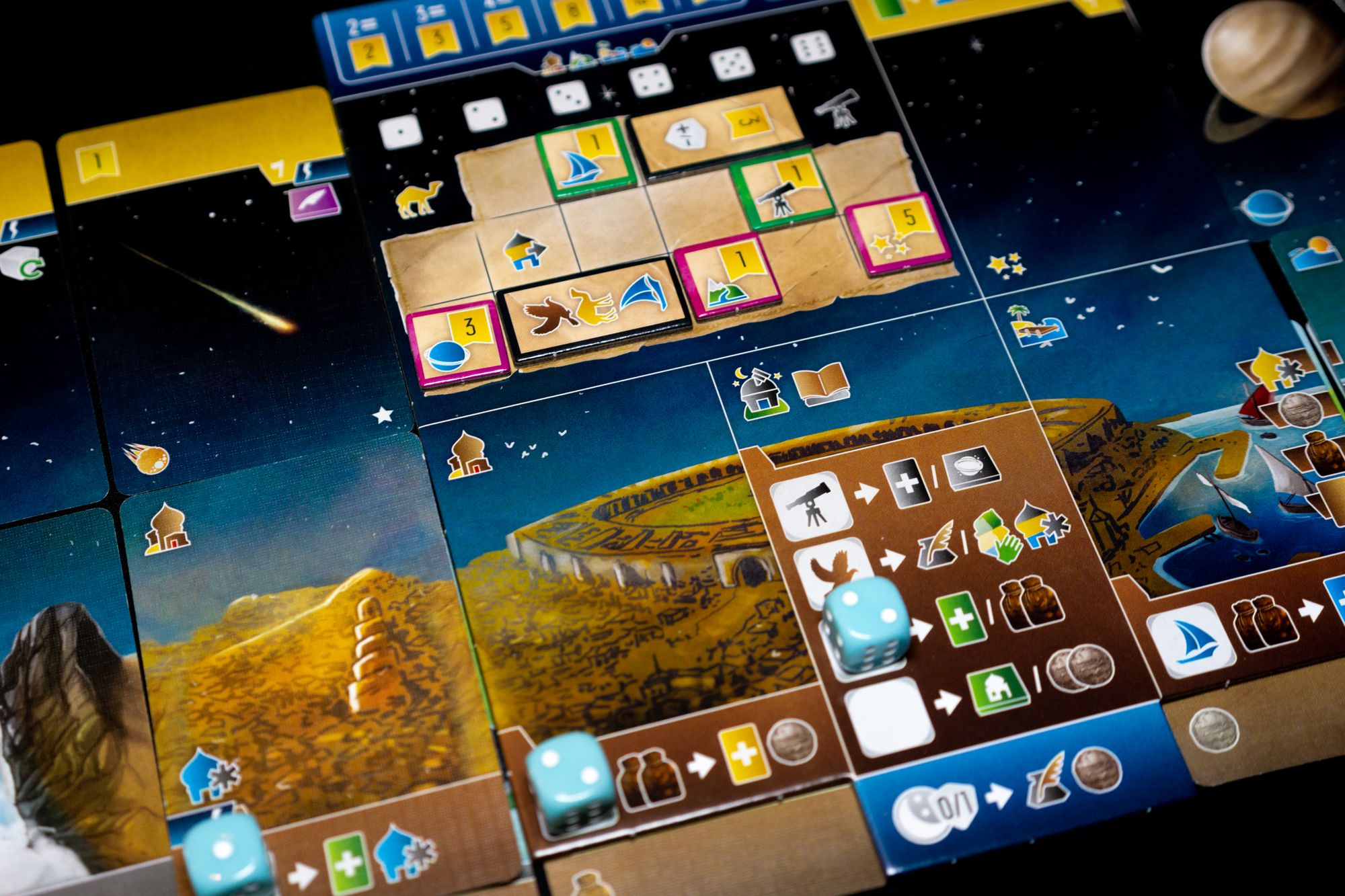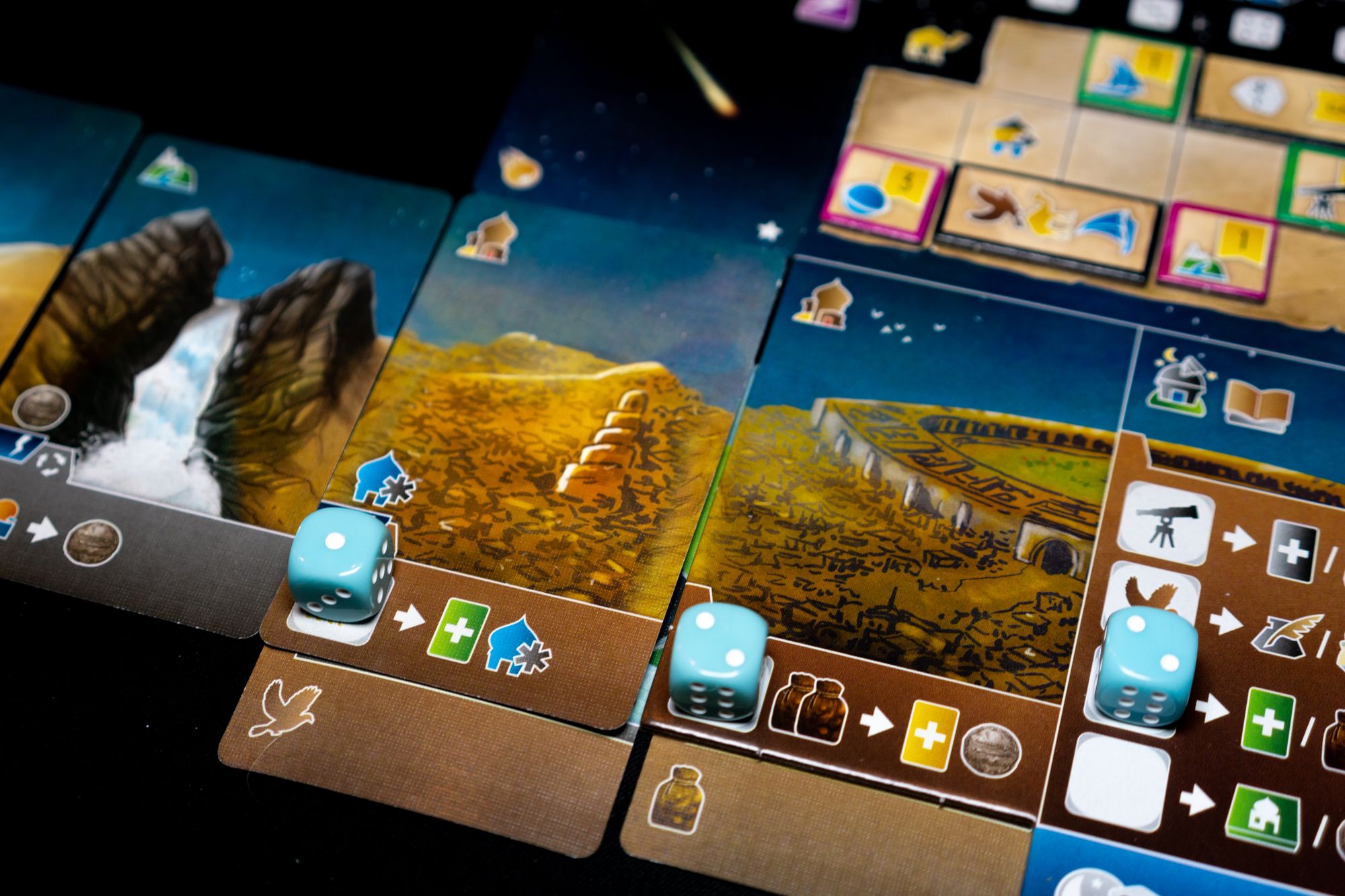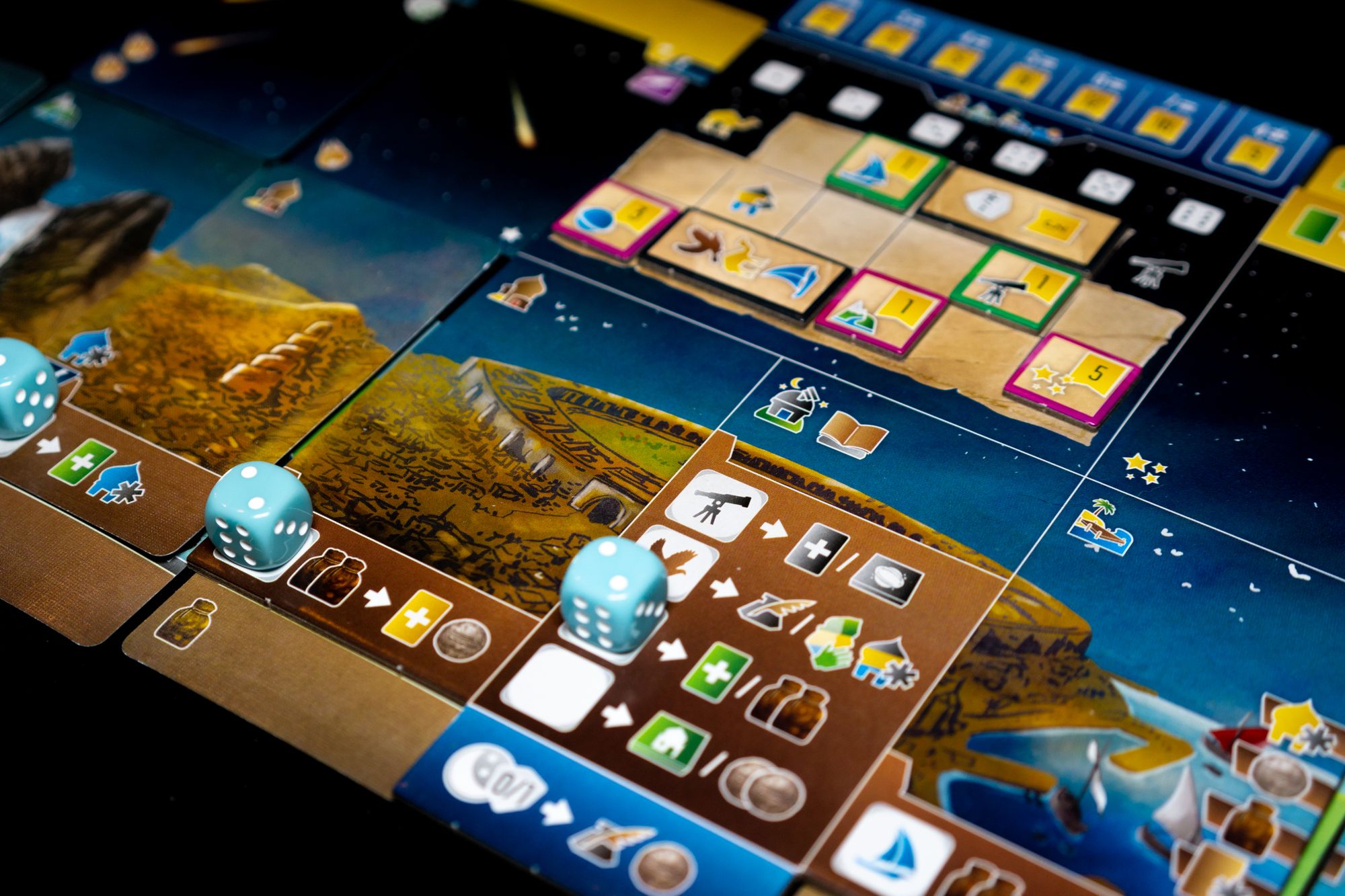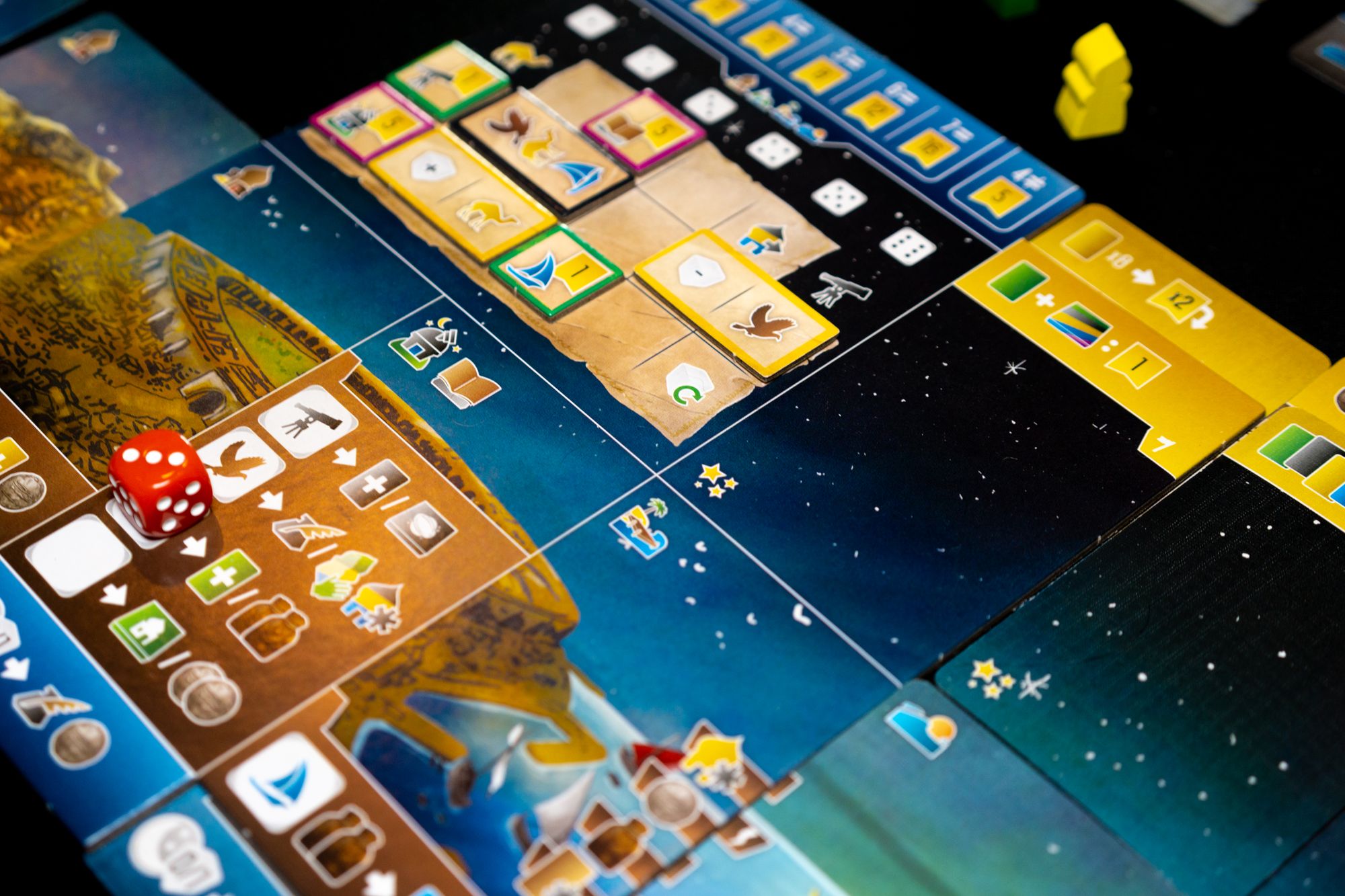 Wayfarers of the South Tigris is the first title in the South Tigries series, and it uses dice in a dice placement kind of way. You start with a few dice placement spots printed on your board, but you can expand those options as you collect more land and sea cards. You roll your dice, but there are plenty of ways to manipulate those dice to get the value (which translates to icons) you need. You can shape the upgrade part of your player board to improve the effectiveness of specific dice values with icons, discounts, or other benefits. Of course, there is a little bit of luck involved, but for me, this isn't an issue as I think dice placement is a fun mechanic in euro games, with Castles of Burgundy and Grand Austria Hotel as prime examples of dice in euro games done right. I think Wayfares can be added to this list.