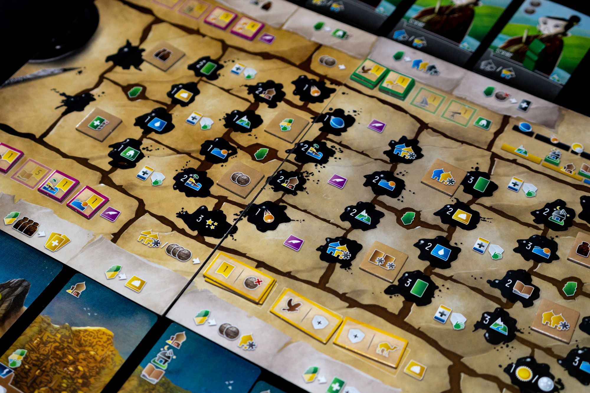 I think the game shines at two or three players; you need a lot of horizontal table space if your tableau grows, so a large table is recommended. It might be a bit too long with four players, but I haven't played it at that player count. The main board consists of 3 parts that can be randomly flipped for a different journal track configuration each time you play.