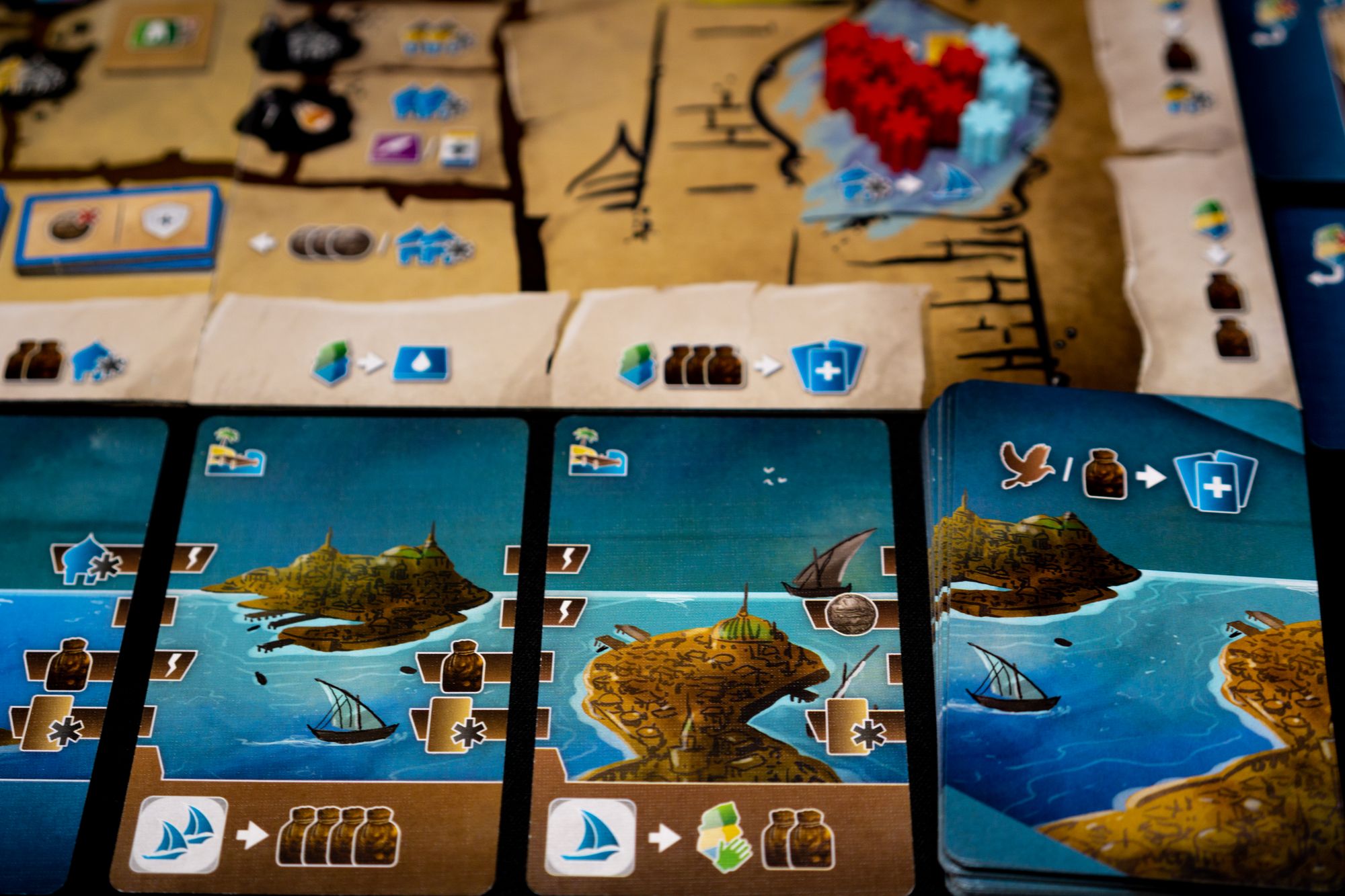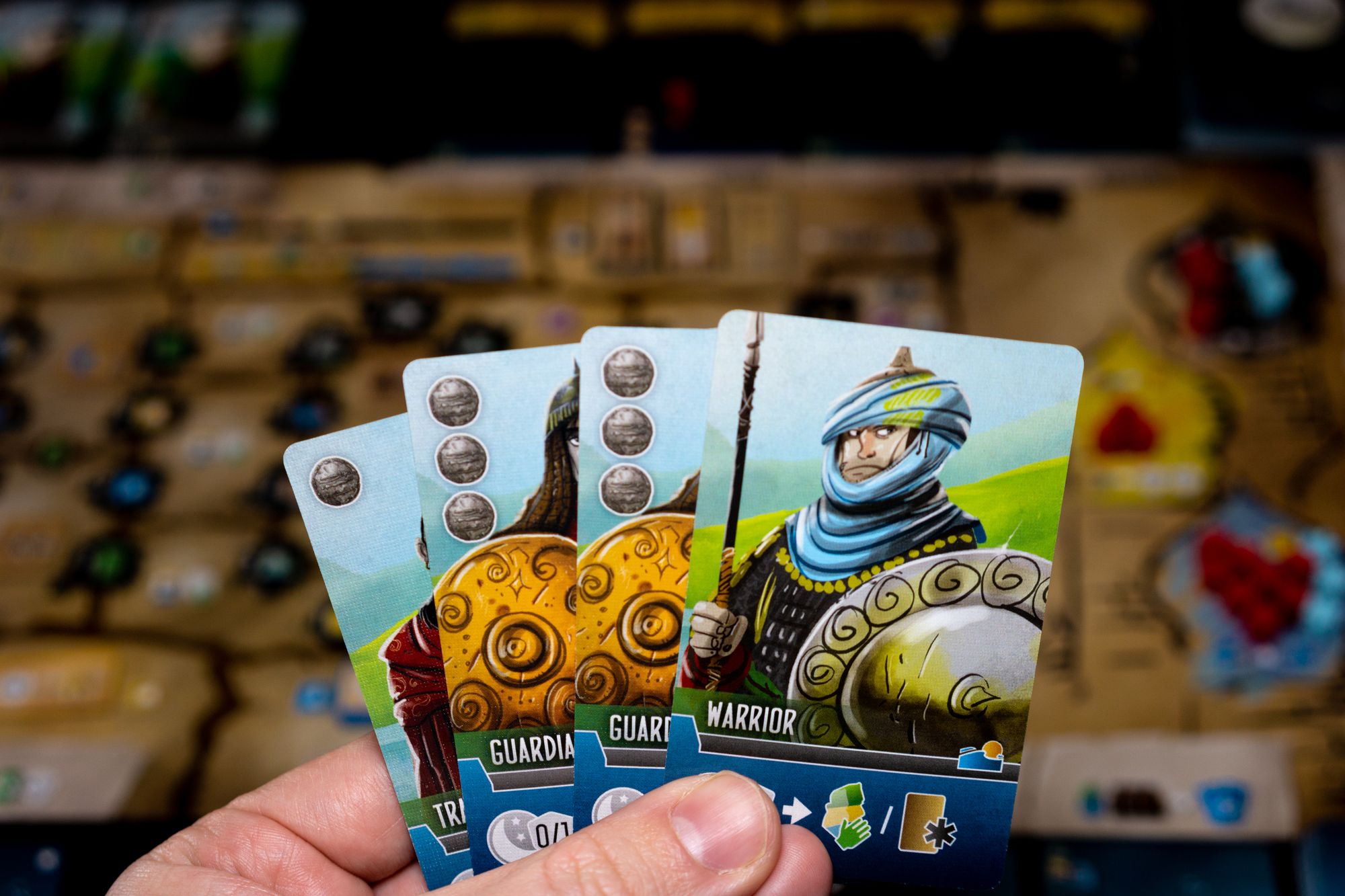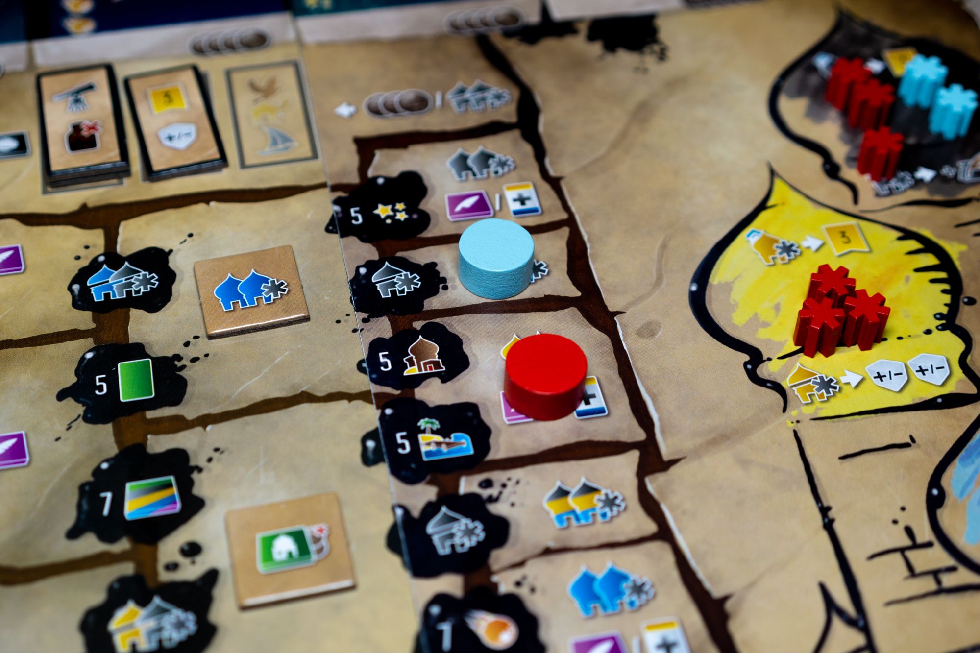 Gaining influence with the three tribes is also essential as you can spend those influence to gain benefits, or if you have the majority of influence in a tribe at the end of the game, you score 3 points. Some benefits also allow you to place an influence marker on specific cards; if another player interacts with that card (acquires or places a worker), they need to pay you a coin or provision. This can be seen as a bit of take-that, but usually, I use it to reserve a card for future purchases as other players are less inclined to buy a card due to the added cost of the influence marker.