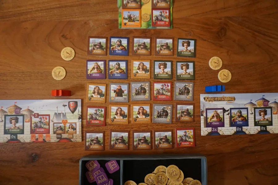 You start the game with you King Pawn on a tile in a 5x5 grid of characters. To collect subjects or activate specialists (like the tax collector or priest) you can jump in straight lines (orthogonal or diagonal). You can either land on the character you want or skip over multiple tiles of the same type to activate/collect all of those. With money you can also buy characters from the ramp to help you with your strategy.