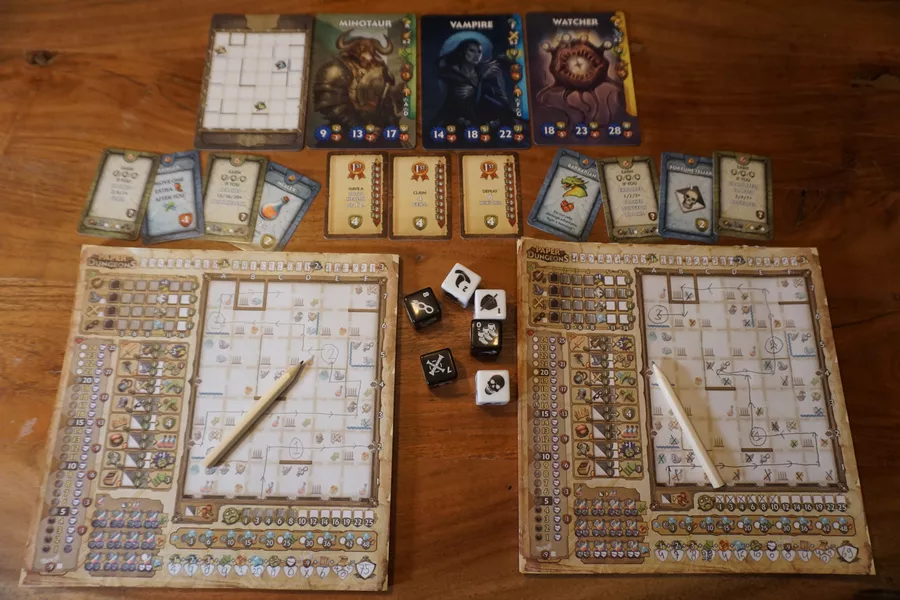 Paper Dungeons is a really good roll-and-write, especially if the theme is of interest to you (to us it is!). The artwork and components are very good (big clunky dice). After round 3, 6 and 8 you get to fight increasingly stronger monsters which give the game nice built-up to the final battle.