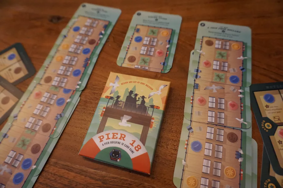 Pier 18 is an 18 cards drafting game in a new series by Alley Cat games of portable "take anywhere" games. It comes in a tiny package with just the cards and the rules are printed inside the box.