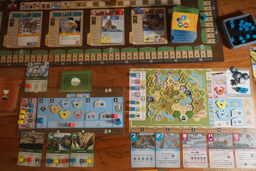 There is a lot in this box, 200+ cards, a large main board, multiple zoo layouts that you can play (that come with special setup rules and/or player abilities). The overall component quality is good. Some boards are made of thick paper instead of cardboard but with the shear amount of stuff in this box I think this was a cost decision which I can totally understand (the game is €60,-).