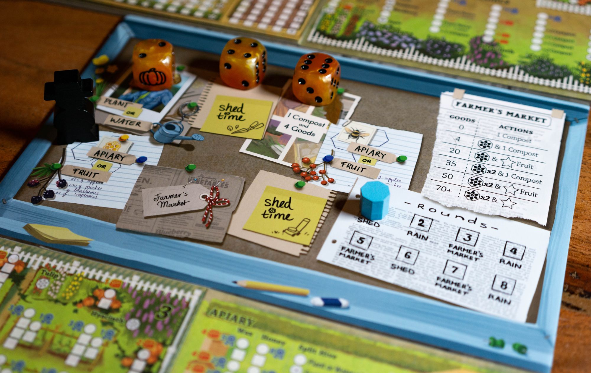 Each round is associated with an Event as noted on the Round Tracker, and during the Event Phase this event is resolved. There are three events in the game: Shed lets you cross of a box in your Shed, Rain waters all zones in your Garden and the Farmer's Market lets all players take actions based on their number of Goods.