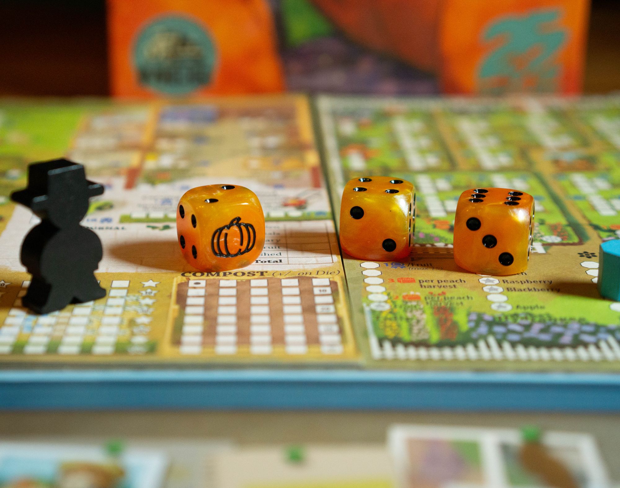 During the Gardening Phase each player will pick a die from the action rondel and performs a Garden Action and the Rondel Action. The Garden Action can be one of two: plant up to two crops in the garden zone matching the die value or water all the crops in the garden zone matching the die value. The Rondel Action can be one of 5 actions based on the location of the chosen die: Shed Time lets you cross of a box in your Shed; Gain 1 Compost and 4 Goods; Apiary or Fruit lets you cross of a box in their respective areas; Farmer's Market lets you take bonus actions based on the number of Goods you have; Plant or Water lets you take an additional Garden Action in the die values Garden zone. After all players have chosen a die, each player also gets to take a Garden Action and Rondel Action using the lowest valued die left on the Action Rondel.