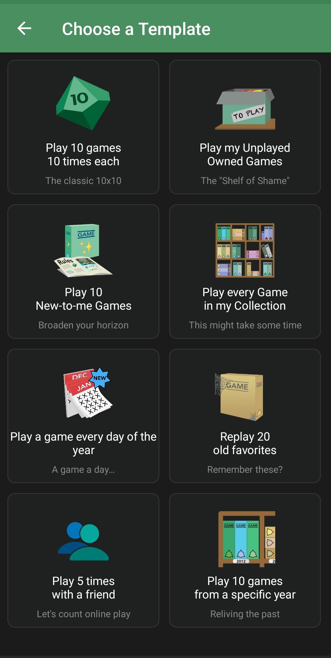 Another thing I like to do is challenge myself. Each year I try to think of a few board game related challenges I would like to do. For example we're currently trying the following two challenges: