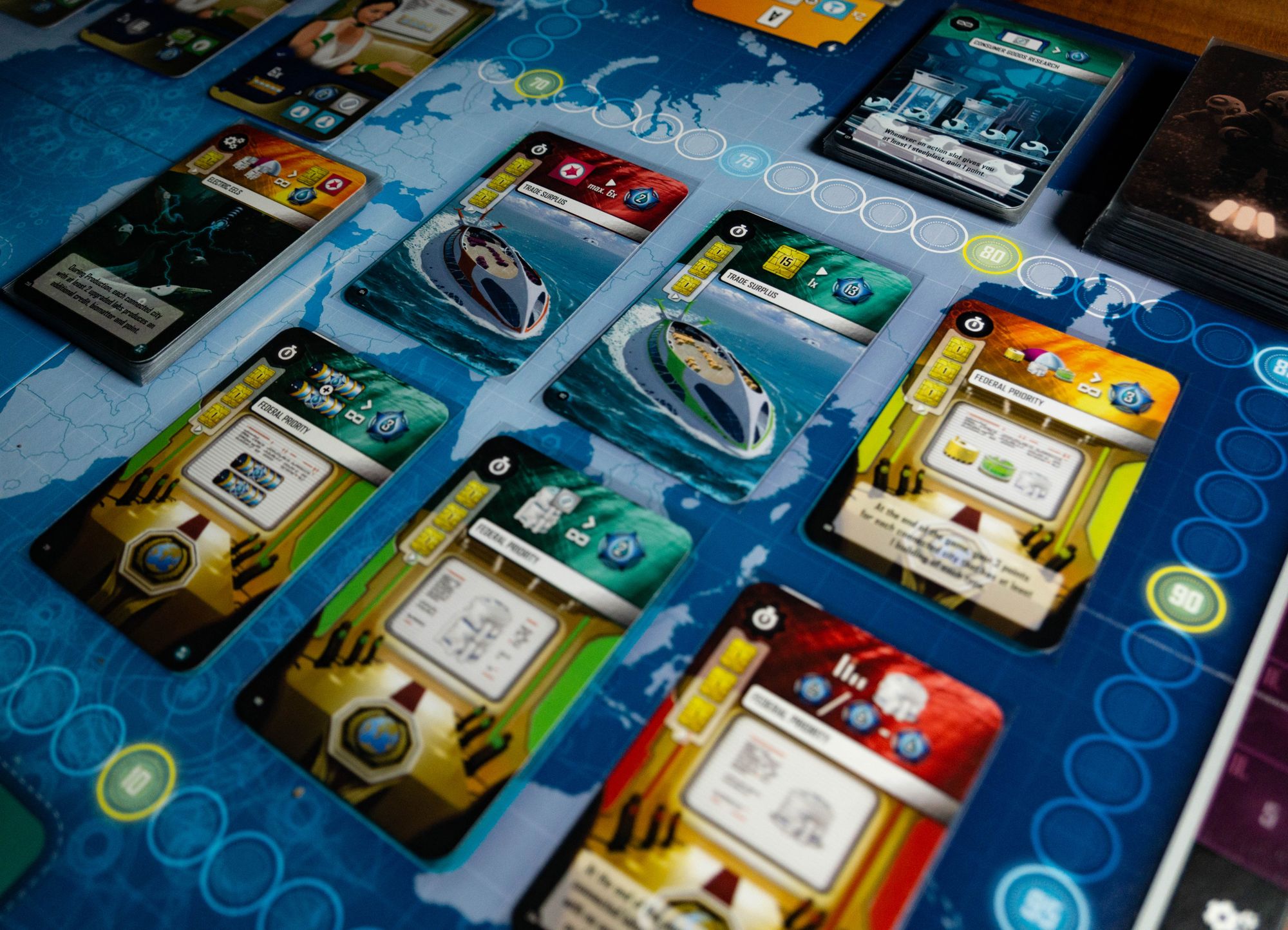 After your turn you redraw up to your hand limit from the current era deck. Each era comes with its own deck of cards and players play a card each action they perform. When the color matches you can either get a one time bonus, production bonuses, assistants, passive effects or end-game scoring cards. Players can also acquire extra powerful "Special" cards.